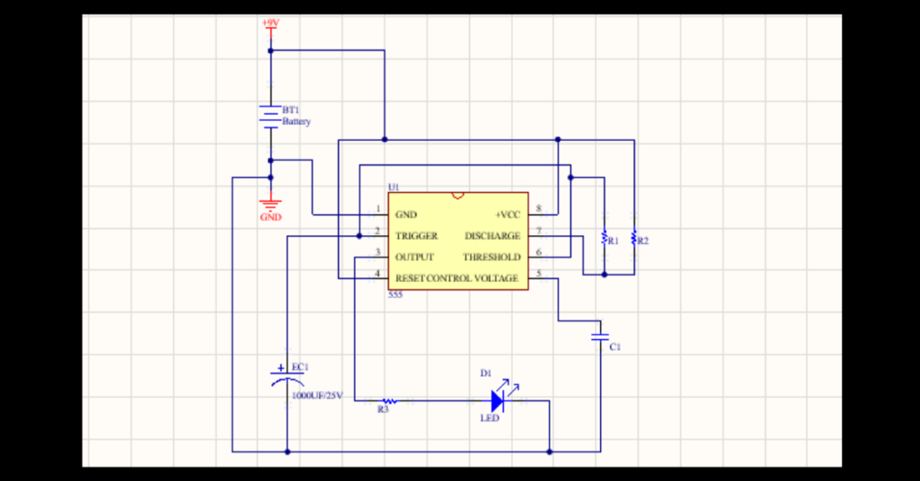 Resistors R1 and R2 along with capacitor C1 form the timing network. The capacitor charges through the resistors and discharges periodically, which causes the output voltage to change between high and low levels. The LED is connected to pin 3 of the 555 timer through a current-limiting resistor.